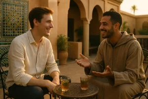 Le darija marocain, c’est votre porte d’entrée vers la vie quotidienne au Maroc. C’est la langue que vous entendrez dans les souks, les cafés et les conversations entre amis. Il s’agit d’une langue vivante, nourrie par l’héritage amazigh, le français, l’espagnol et même l’anglais.
